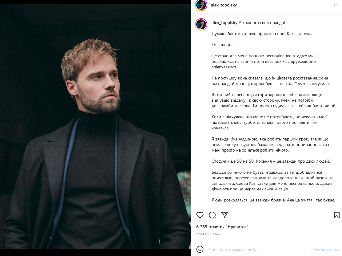 В пост-шоу "Холостяк. Жизнь после проекта" Катя Лозовицкая рассказала, что они с Алексом Топольским расстались по ее инициативе. После выхода программы в эфир победительница 12 сезона написала пост, в котором подробно описала, чего ей не хватало в отношениях с главным героем. Бизнесмен отреагировал на публикацию бывшей избранницы и назвал свою версию разрыва.