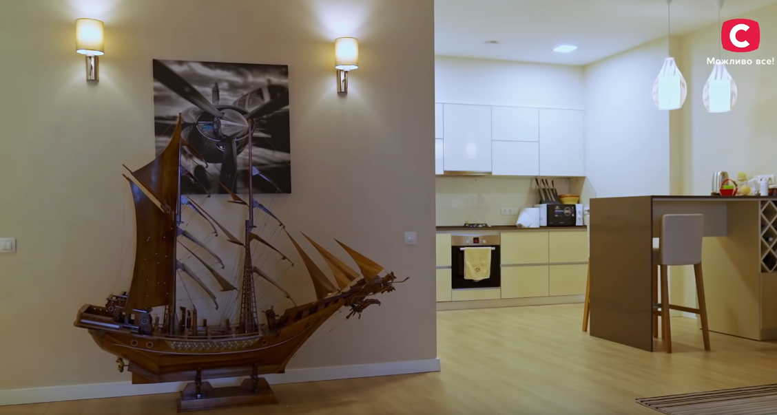 В квартире много фотографий самой Билык и ее детей. Также интерьер дополнен статуэтками и картинами в морской тематике.