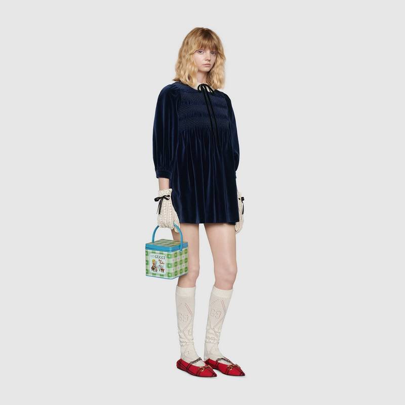 "Дизайн этой сумки напоминает винтажный ланч-бокс, а причудливый принт и ручка сверху - это темы детства, которые прослеживаются во всей коллекции", - отметили создатели.