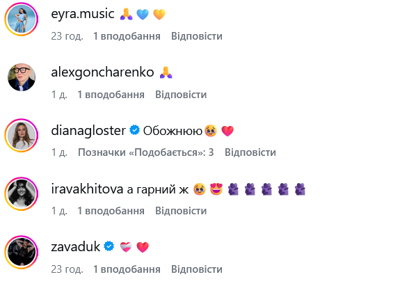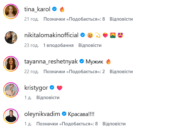 Квитку в комментариях поддержали немало звездных коллег, таких как Тина Кароль, Tayanna, Никита Ломакин, Вадим Олейник, Диана Глостер, Алексей Гончаренко, Владимир Завадюк, Марта Адмачук.