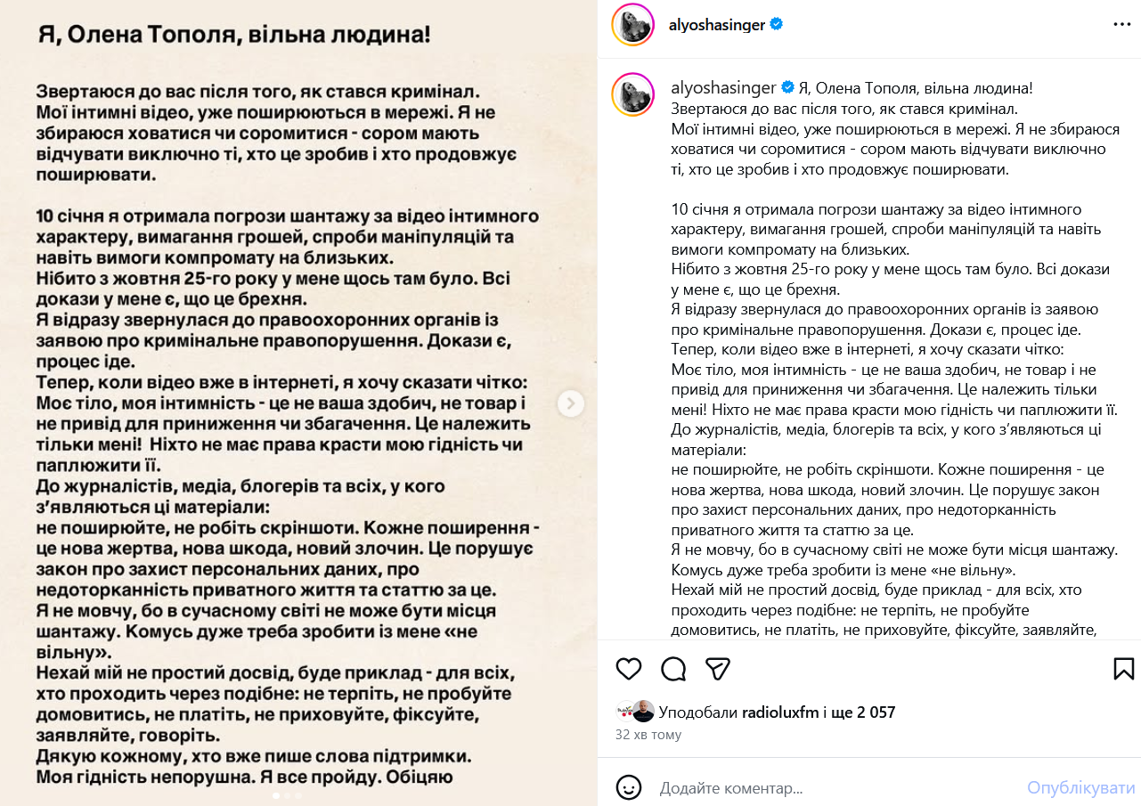 "Я сразу обратилась в правоохранительные органы с заявлением об уголовном правонарушении. Доказательства есть, процесс идет. Теперь, когда видео уже в интернете, я хочу сказать четко: Мое тело, моя интимность - это не ваша добыча, не товар и не повод для унижения или обогащения. Это принадлежит только мне! Никто не имеет права красть мое достоинство или порочить его", - подчеркнула Тополя.