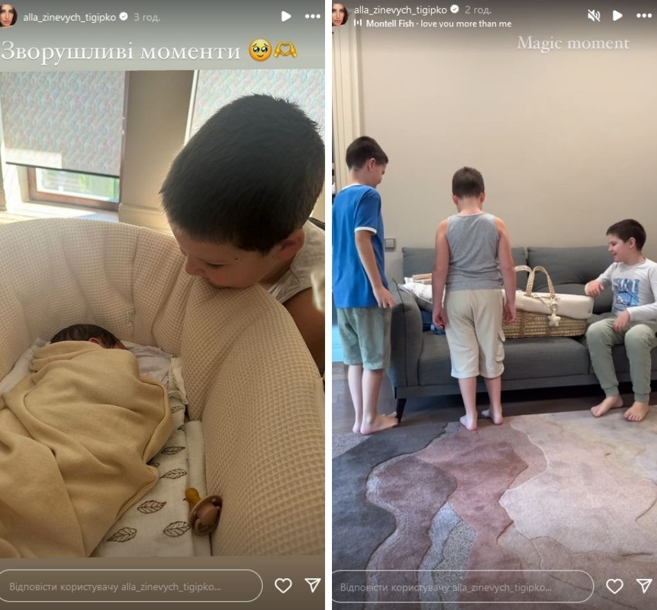 Также многодетная мама показала трогательные кадры знакомства старших братьев с маленькой сестрой. Зиневич и Тигипко воспитывают сыновей Сергея (2011), Станислава (2013) и Александра (2016).