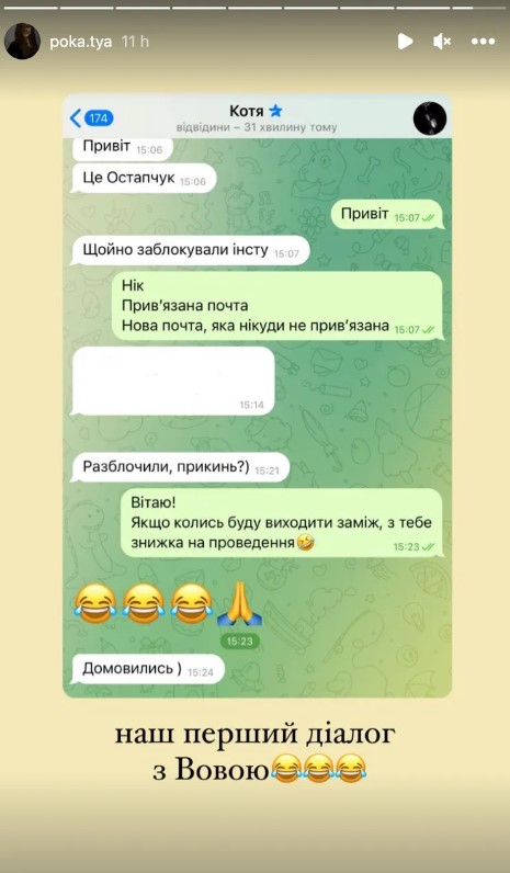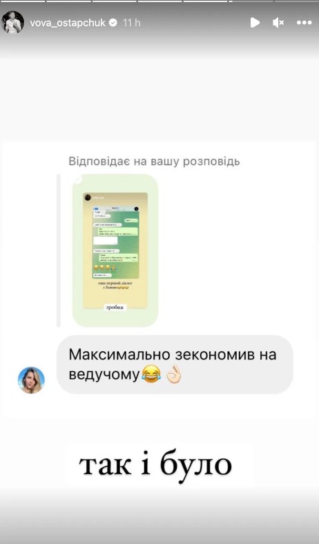 Затем Остапчук сделал репост этого скриншота и заявил, что сделал скидку. После чего опубликовал шутку от подписчицы, которая отметила, что "мужчина максимально сэкономил на ведущем", поскольку завязал отношения с Катей. "Так и было", – подтвердил шоумен.