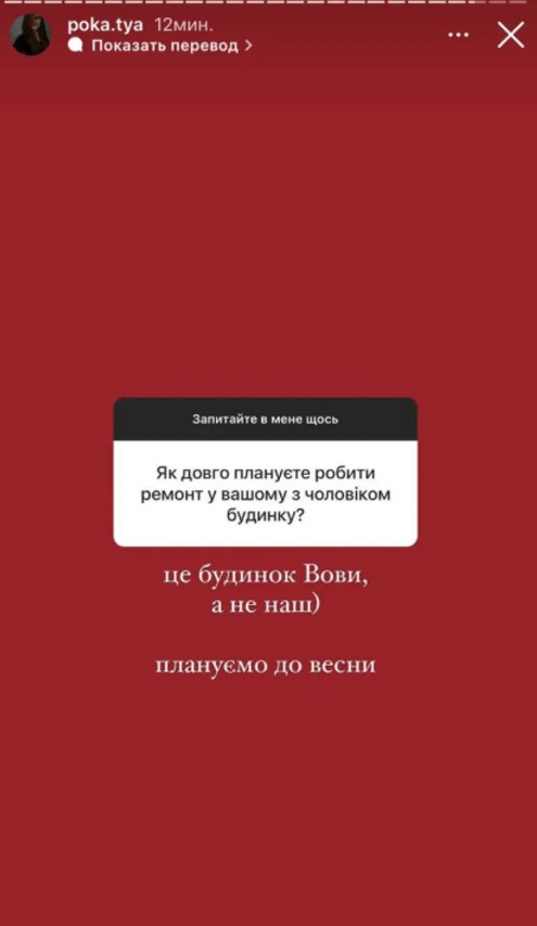 Также девушка ответила на вопрос, касающийся дома Остапчука и его бывшей избранницы Кристины Горняк. Журналистка уточнила, что ремонт там продлится до весны следующего года. Однако будет ли жить там пара после ремонта - остается неизвестным, потому что недавно Горняк сообщала в своем блоге, что с ней вопрос об имуществе никто не решил, хотя половина этого дома по закону принадлежит ей как совместно нажитое в браке. Женщина готова решать этот вопрос через суд, если не будут установлены личные договоренности.