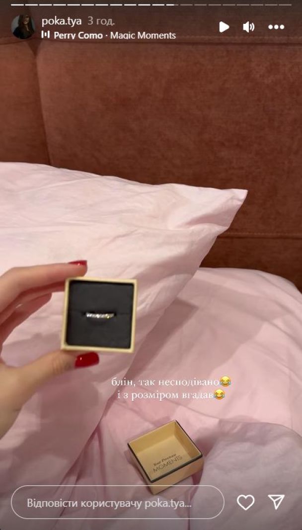 О презенте избранница шоумена рассказала в Instagram-stories. На опубликованных фото она продемонстрировала, как нашла утром под подушкой коробочку, в которой лежало кольцо из желтого золота и с бриллиантами. "Блин так неожиданно. И с размером угадал", - говорится в подписи к одному из кадров, на котором Екатерина показывает свою обновку.