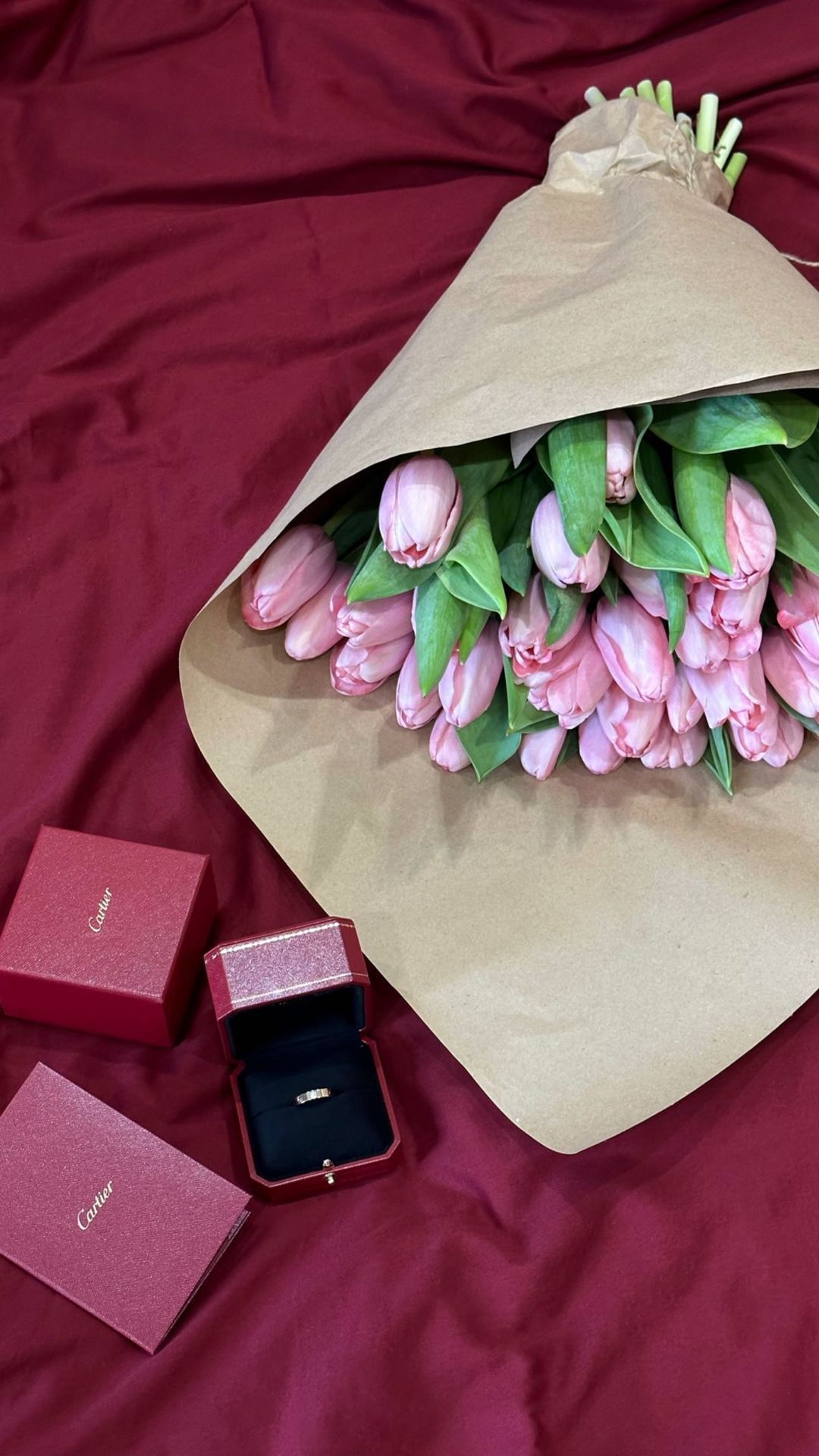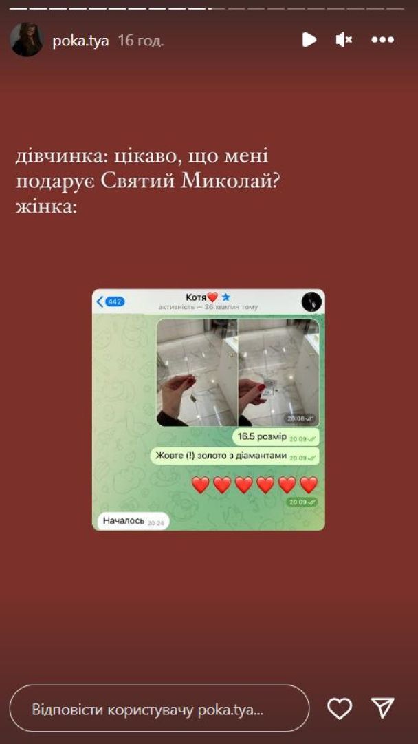 Девушка также поделилась, что намекнула на подарок, который хотела получить, еще за несколько дней до праздника. Она продемонстрировала переписку, в которой скинула фото желаемого презента, а также напомнила любимому размер своего пальца.