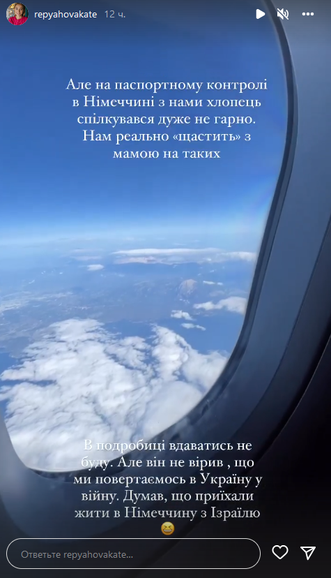 "Перелет был относительно спокойным. Но на паспортном контроле в Германии с нами парень общался не очень хорошо. Нам реально "везет" с мамой на таких. В подробности вдаваться не буду. Но он не верил, что мы возвращаемся в Украину в войну. Думал, что приехали жить в Германию из Израиля", - поделилась Катя в Instagram-историях.