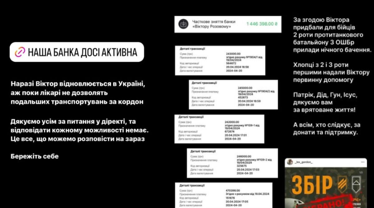 Кроме того, Ольга также добавила, что банка со средствами, которые собирали для бойца, до сих пор остается открытой. Оттуда уже сняли около 1 млн 446 тысяч грн для того, чтобы купить приборы ночного видения для защитников 2 роты противотанкового батальона 3ОШБр, поскольку бойцы из 2 и 3 роты были теми кто, оказал Розовому первую помощь после полученной травмы.