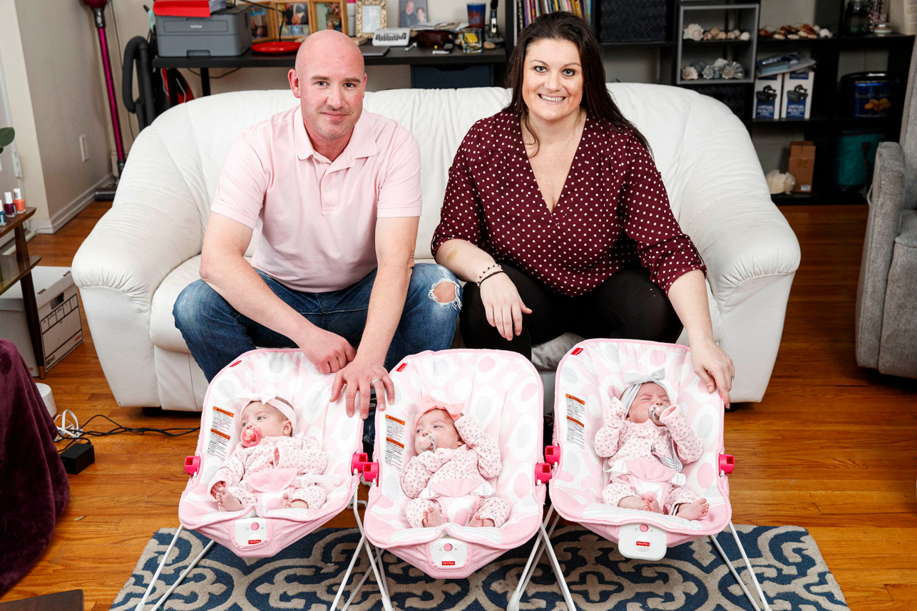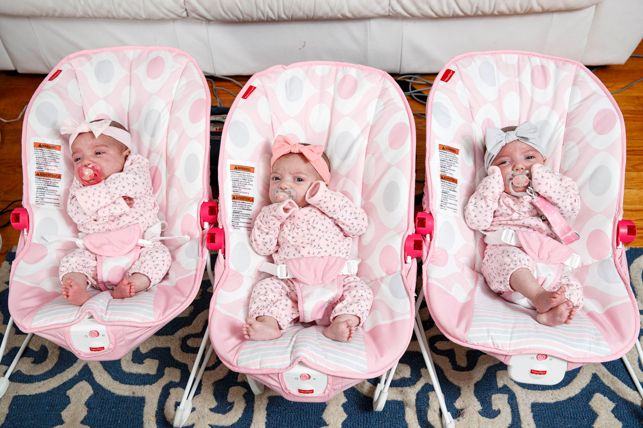 На 32 неделе врачи сделали Геттинг кесарево сечение: вес девочек составлял 1,4 кг, 2,1 кг и 1,9 кг. Новорожденных доставили в отделение интенсивной терапии, и они пробыли в больнице более 7 недель. В конце октября семейная пара забрала тройняшек домой, и теперь они чувствуют себя превосходно, хотя на родителей обрушились тройные заботы.
