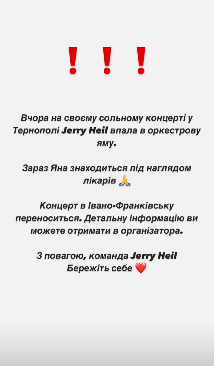Тернопольский новостной сайт 0352.ua сообщает, Jerry Heil решила подойти ближе к слушателям, но оступилась и упала в оркестровую яму. Вероятно, причиной стал софит, который ослепил певицу.
