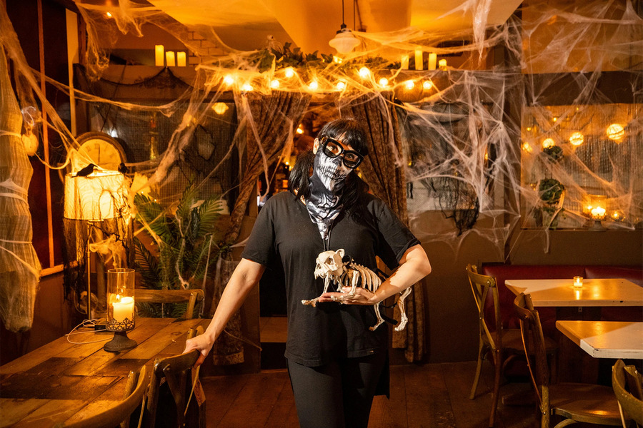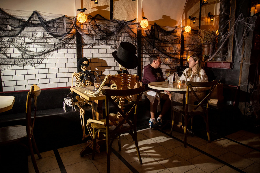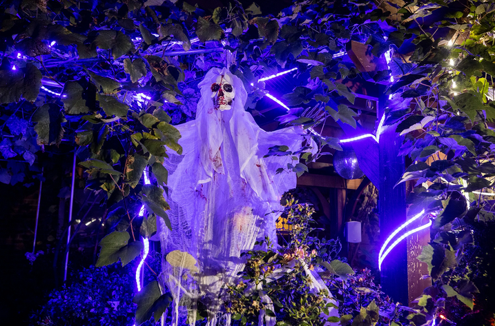 На территории расположилось несколько скелетов, катафалк, кладбище, несколько клоунов, ведьм, а также рыцарь и дракон. Для тех, кто любит Instagram, на заднем дворе есть "котел для селфи", где каждый желающий сможет сделать фото.