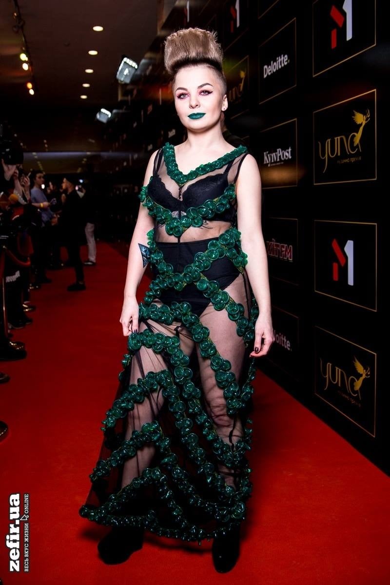 Певица Кира Мазур на показе Залевского в авангардном платье из презервативов, 2017 год