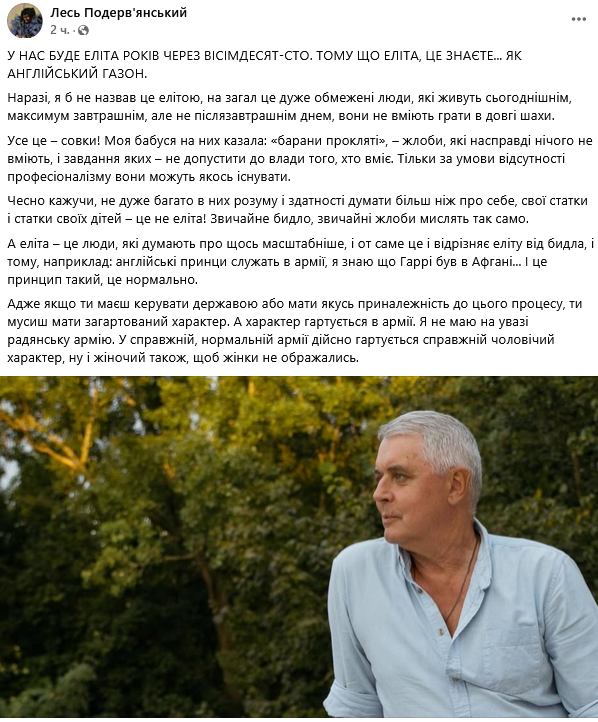 Писатель, драматург и художник Лесь Подервянский спрогнозировал формирование истинной украинской элиты в очень отдаленной перспективе.