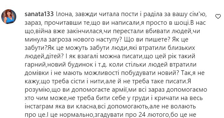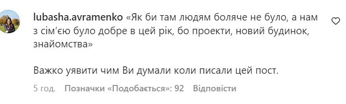 "Как бы там людям больно ни было, а нам с семьей было хорошо в этот год, потому что проекты, новый дом, знакомства"... "Трудно представить, о чем Вы думали когда писали этот пост";