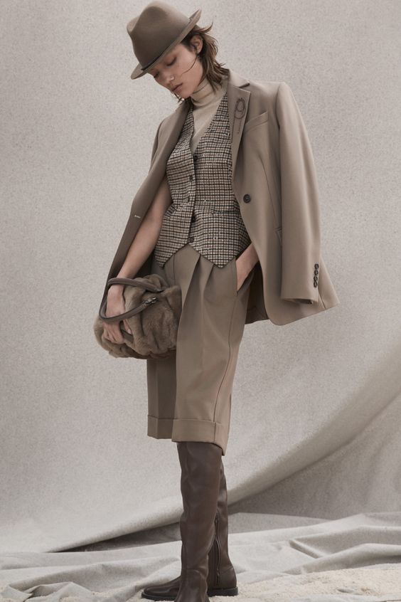 Если вы устали от классики – выберите костюм с жилетом и удлиненными шортами. Дополнить образ можно высокими сапогами на плоском ходу, сумкой и шляпой.