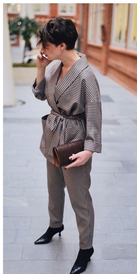 Еще один вариант для выхода на работу – брючный костюм с модным принтом "гусиная лапка" и поясом. Этот образ с жакетом кроя кимоно и зауженными брюками будет смотреться очень стильно.