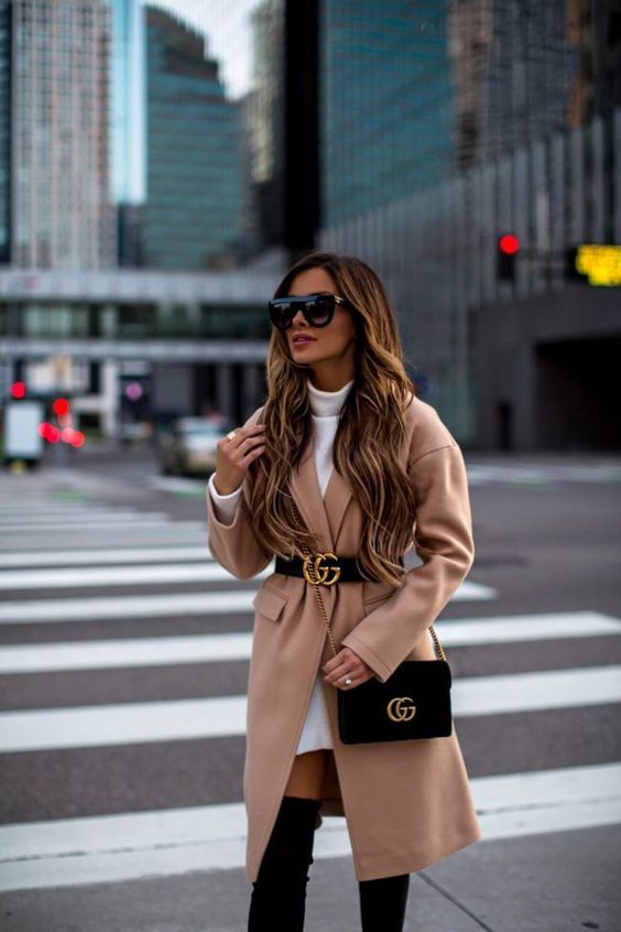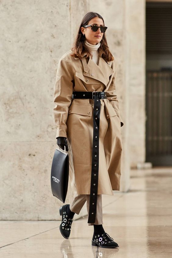 Одно из самых распространенных сочетаний – пояс поверх осеннего пальто. Вы можете выбрать как классический пояс, так и ремень с логотипом любимого бренда или даже пояс-сумку. Он может как контрастировать с цветом верхней одежды, так и быть в одной цветовой гамме.