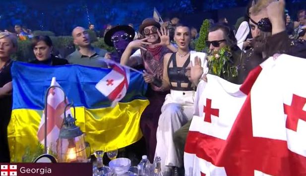 Во втором полуфинале "Евровидения-2022" от участников исходила новая волна поддержки Украины, к примеру, во время ожидания результатов представитель Грузии Circus Mircus развернул украинский флаг, а певец из Эстонии украсил сценический пиджак желто-синей ленточкой.