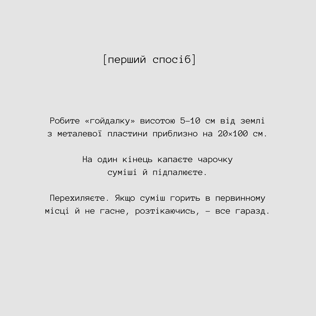 Первый способ: делаете "качели" высотой 5-10 см от земли из металлической пластины примерно на 20х100 см. На один конец капаете рюмку смеси и поджигаете. Переворачиваете, если смесь горит в первоначальном месте и не гаснет, растекаясь, все хорошо.
