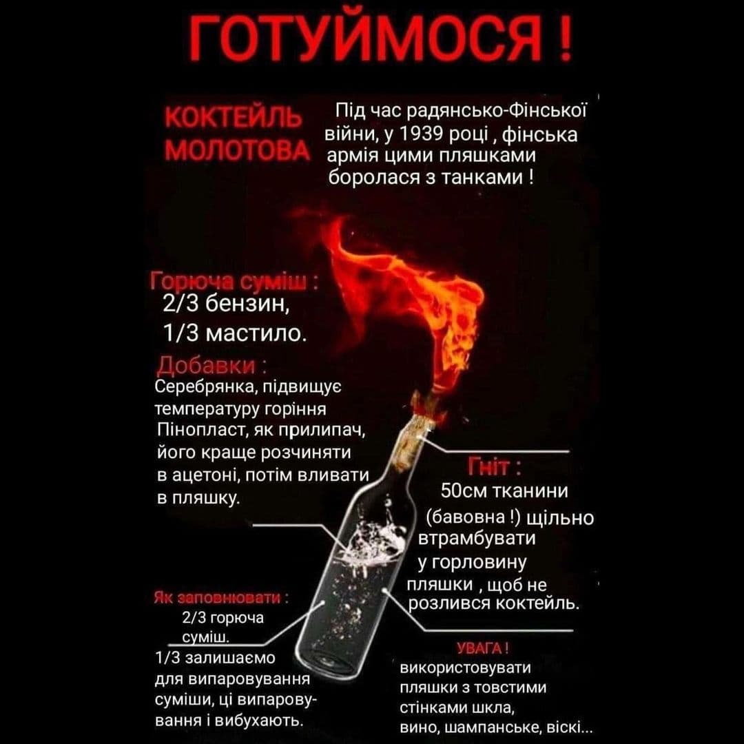 - Испарения горючего и растворителей опасные и токсичные. Готовить коктейли Молотова следует только на свежем воздухе с регулярными перерывами каждые полчаса.