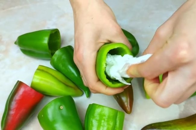 Отбираем лучшие крупные плоды, вынимаем сердцевину с семечками. На плите подогреваем воду и отправляем каждый перец в кипящую воду на 30 секунд, но не больше. Затем вынимаем и ждем, пока он остынет. Осторожно складываем плоды друг в друга, как пирамидку.
