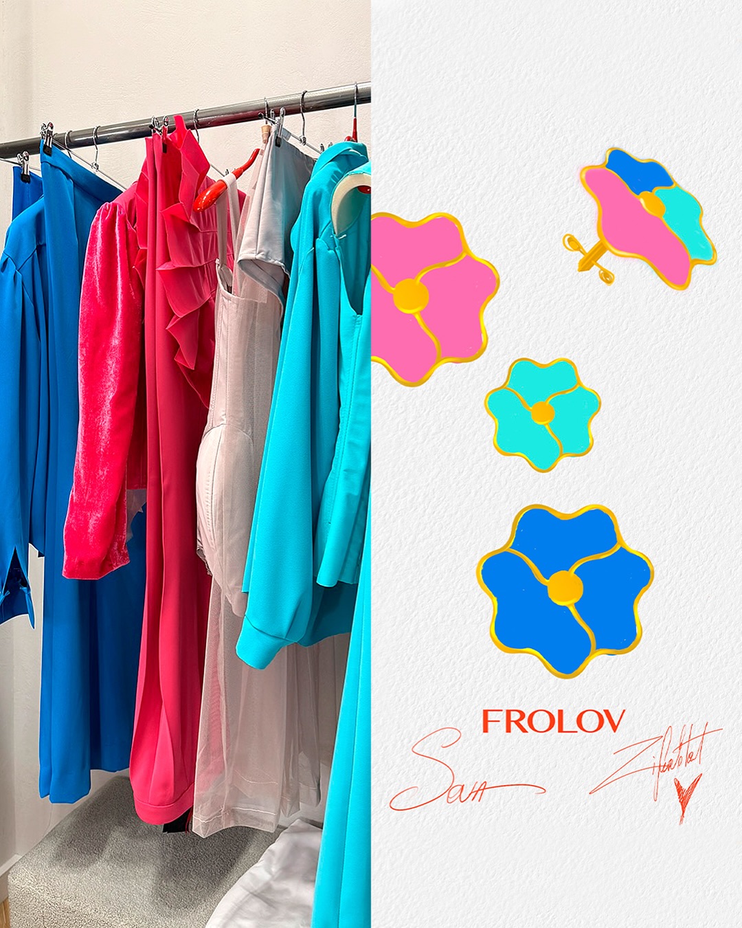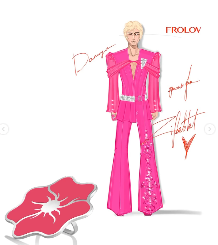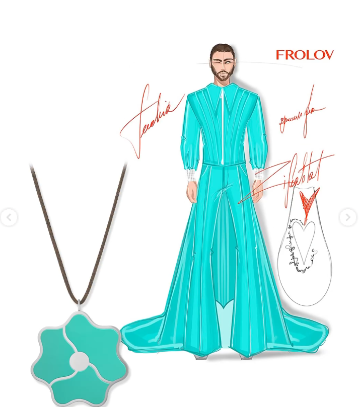 Как рассказали на странице бренда в Instagram, украшения для наших ребят изготовлены из серебра и покрыты эмалью ярких цветов - насыщенного малинового, синего и нежно-бирюзового, продолжающих палитру костюмов FROLOV.