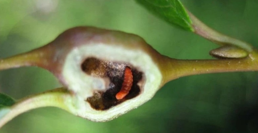 Главной задачей при обрезке малины является удаление старых и больных ветвей, которые уже не дадут много ягод в новом сезоне. Однако следует обратить внимание и на побеги с утолщениями. Это последствия деятельности стеблевой галлицы – наиболее распространенного вредителя малины. Если разрезать такую выпуклость, то можно увидеть червоточину, заполненную экскрементами и желтыми личинками. Молодые личинки вгрызаются в древесину, в результате чего через 1-2 недели образуются характерные вздутия – галлы, которые увеличиваются в размере, а осенью полностью окольцовывают побег. Из-за повреждения нарушается сокодвижение, замедляется рост побега, он засыхает или же ломается от сильного ветра.