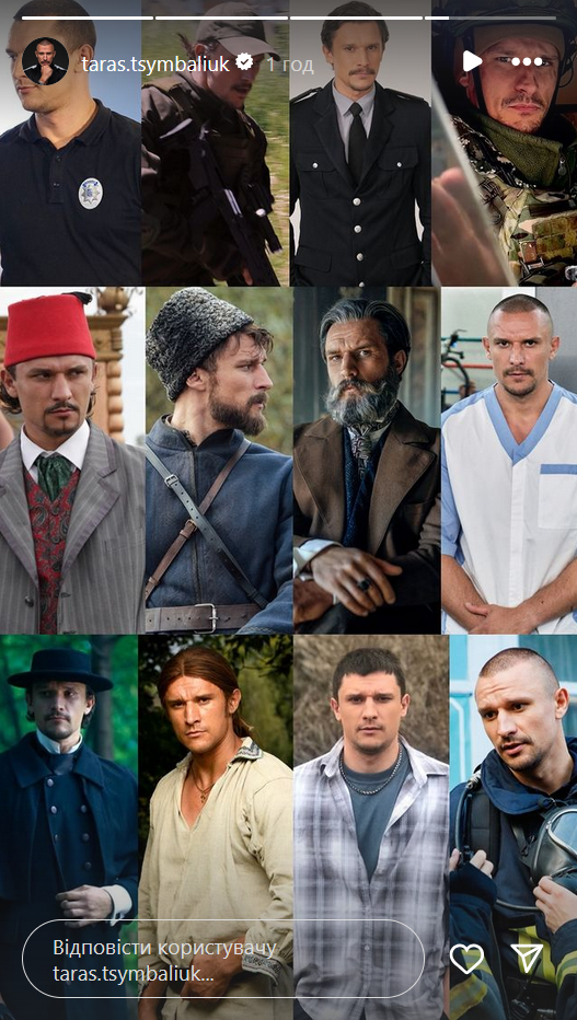 В следующей "сториз" актер напомнил свои самые яркие роли, сделав коллаж из фотографий его героев из популярных сериалов: Назара из "Кріпосної", Карпо из "Спіймати Кайдаша", Ивана из "Черного ворона", турецкого посла из "Останнього яничара", Андрея из "Кави з кардамоном", Андрея из "Жіночого лікаря", спасателя из нового проекта "Кохання і полум'я" и других.