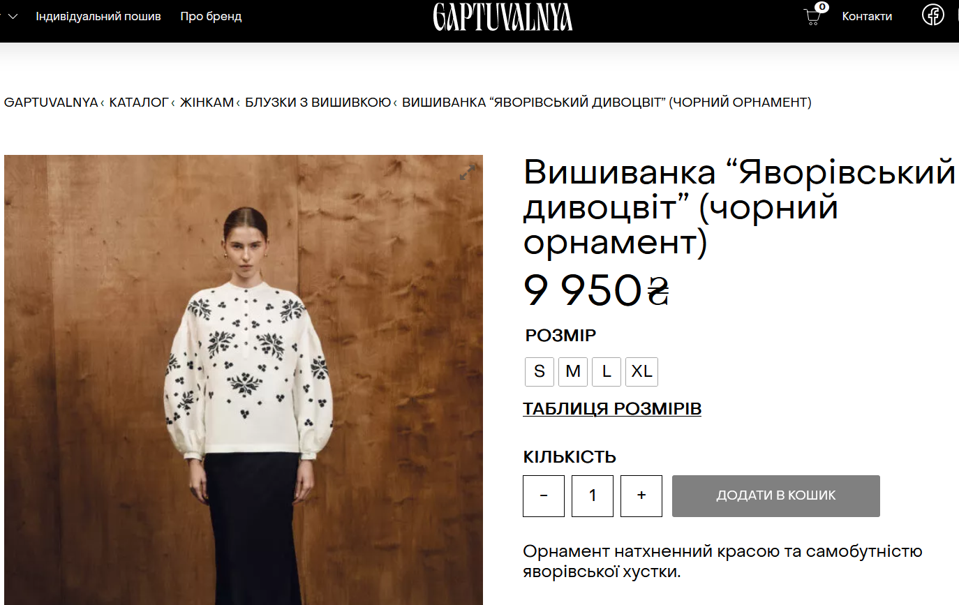 Белоснежная вышитая блузка с черным орнаментом называется "Яворівський дивоцвіт", на создание узора дизайнеров вдохновила красота и самобытность яворовского платка. За вышиванку как у Елены Зеленской придется отдать 9 950 грн.