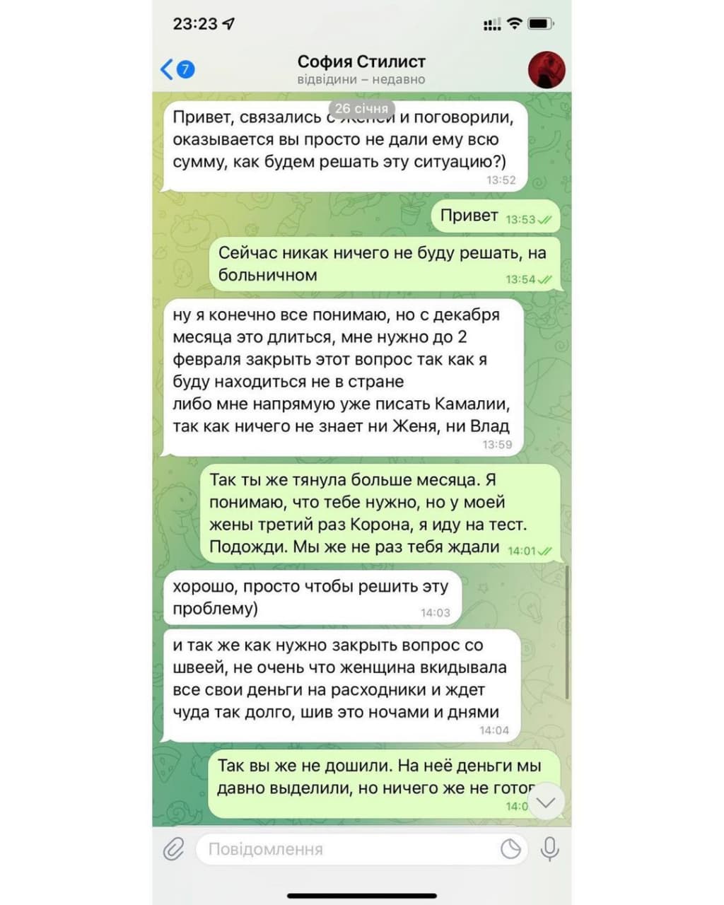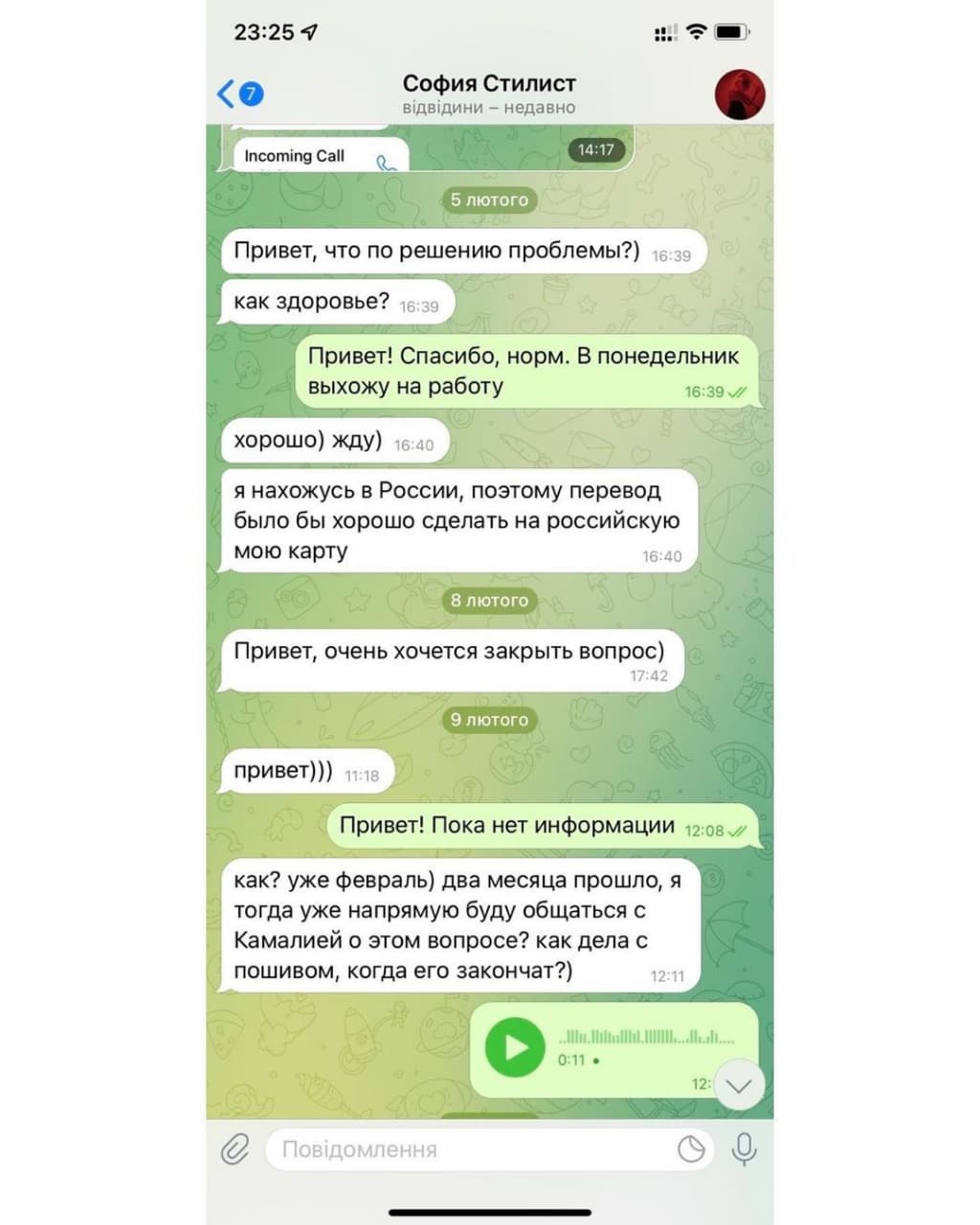 Стилист София Неведомая недавно обвинила украинскую певицу Камалию в том, что она уже три месяца не выплачивает ей гонорар за проделанную работу. По словам девушки, из обещанных 400 долларов она получила только 200.