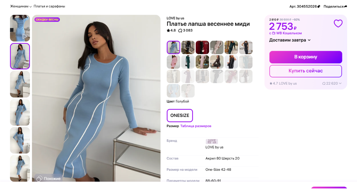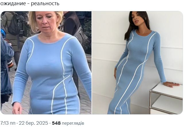 На одном из маркетплейсов для продажи указано, что цена платья "Лапша весенняя миди", которое "выгуляла" Захарова, составляет 2 753 рубля, то есть около 1300 грн.