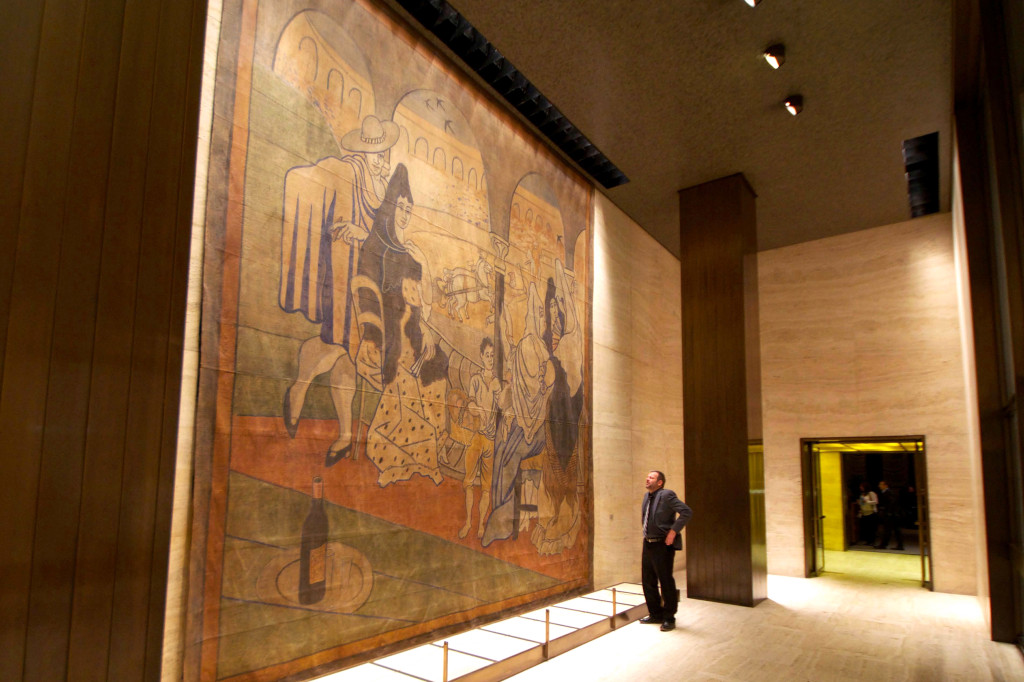 Считается, что произведение представляет собой этюд расписной сценической шторы "Треуголка", которую испанский художник создал в 1919 году для балетной труппы Ballets Russes. Занавес размером 5х6 метров долгие годы висел в ресторане Four Seasons в Нью-Йорке. В 2015 году работа поступила в коллекцию Нью-Йоркского исторического общества, где находится по сей день.