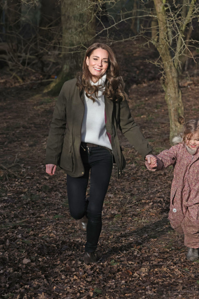 На днях Кейт Миддлтон прилетела в Данию и посетила особый детский сад на природе (Forest Kindergarten). Для встречи с детьми герцогиня Кембриджская выбрала любимые джинсы скинни, которые ранее надевала во время поездки в Шотландию.