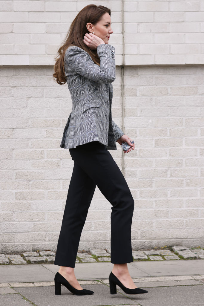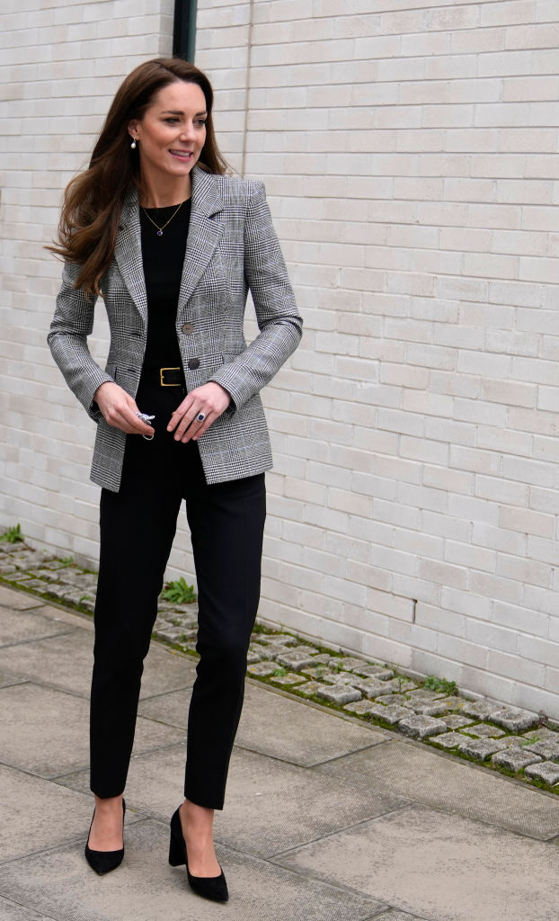 Кейт посетила общественный центр PACT (Родители и дети вместе), где встретилась с родителями, волонтерами и медицинскими работниками. Для рабочего мероприятия королевская особа выбрала укороченные черные брюки с завышенной талией и ремнем с золотистой пряжкой. К ним она подобрала простую черную блузу без декора и классический серый жакет в клетку. Образ деловой женщины Миддлтон дополнила туфлями на среднем каблуке с острым носком.