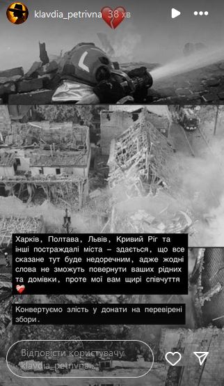 "Харьков, Полтава, Львов, Кривой Рог и другие пострадавшие города - кажется, что все сказанное здесь будет неуместным, ведь никакие слова не смогут вернуть ваших родных и дома, однако мои вам искренние соболезнования", - написала Клавдия Петрівна.