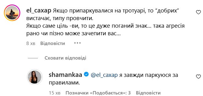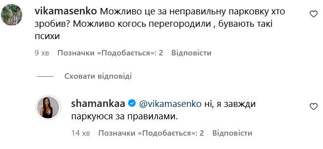 В комментариях предположили, что, возможно, это сделали не хейтеры, а кто-то из водителей на парковке, кому Алина могла перекрыть выезд, на что Шаманская заявила, что всегда паркуется по правилам.