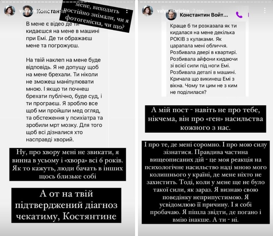 "У меня есть 40-минутная аудиозапись разговора с твоей мамой, после того, как ты пожила с ней в одной квартире. Она говорит, что ты убиваешь ребенка. Что нужно установить камеры наблюдения в квартире. Что нужно забирать у тебя ребенка. Что ты всегда была такой, - писал Войтенко Марининой. - У меня есть видео, где ты бросаешься на меня в машине при Эми. Где ты обижаешь меня и угрожаешь".
