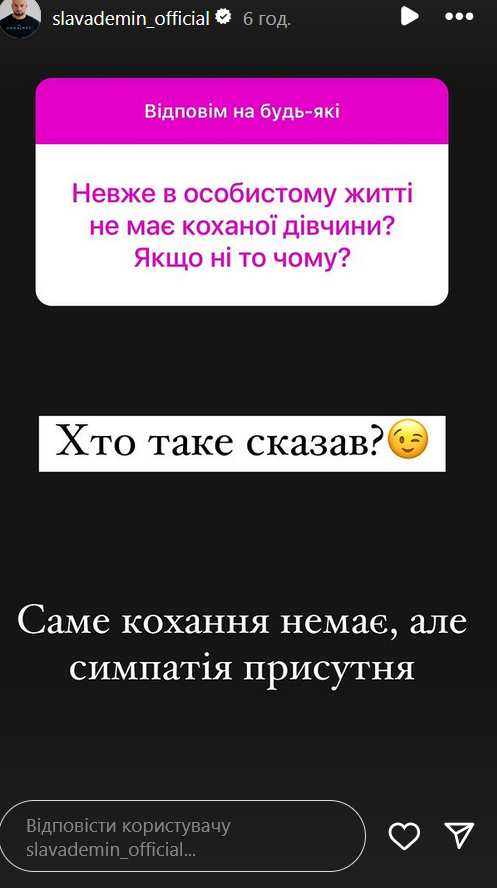 Сейчас, по словам Демина, в его жизни нет любви, но симпатия присутствует.
