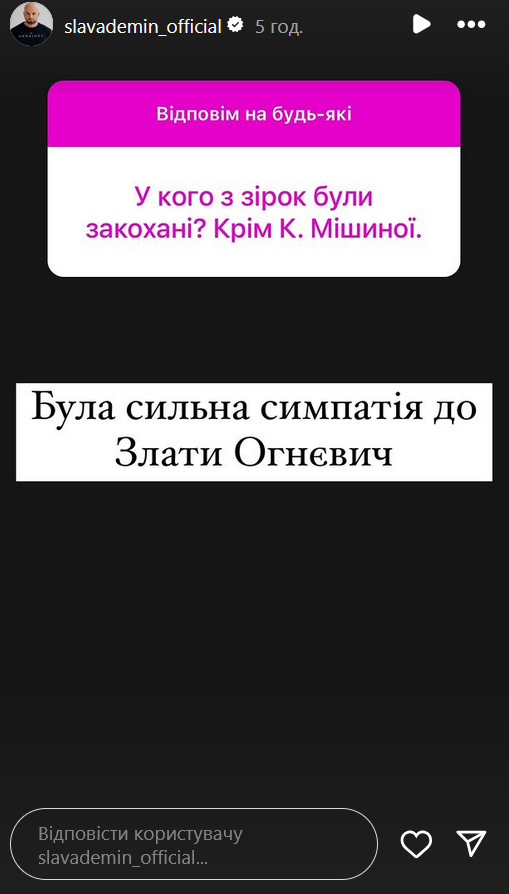 Украинский телеведущий и интервьюер Слава Демин, который ранее рассказал о чувствах к Ксении Мишиной, признался, что имел симпатию к еще одной знаменитости - Злате Огневич.