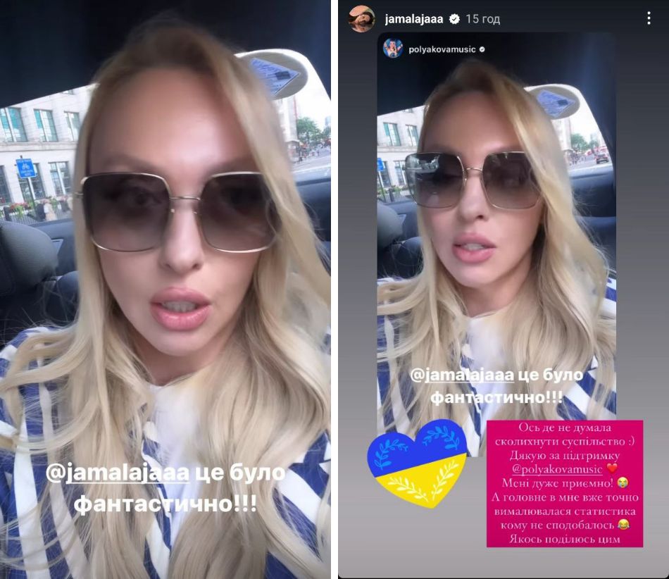 Джамала тем временем поблагодарила Олю Полякову за поддержку. По словам певицы, ее версия гимна не понравилась лишь определенной категории людей.