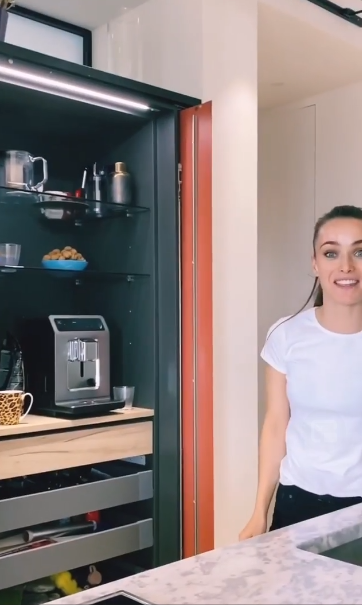 На кухне есть остров, куда встроена варочная поверхность и раковина. На нем актриса не только готовит и моет посуду, но и любит сидеть с бокалом безалкогольного шампанского. Мебельные фасады в этом помещении разных оттенков: от ярких синих и терракотовых до пастельных тонов.