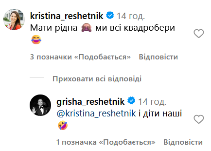 В комментарии у мужу пришла Кристина Решетник и написала, что "мы все квадроберы". "И дети наши", - добавил отец троих сыновей.
