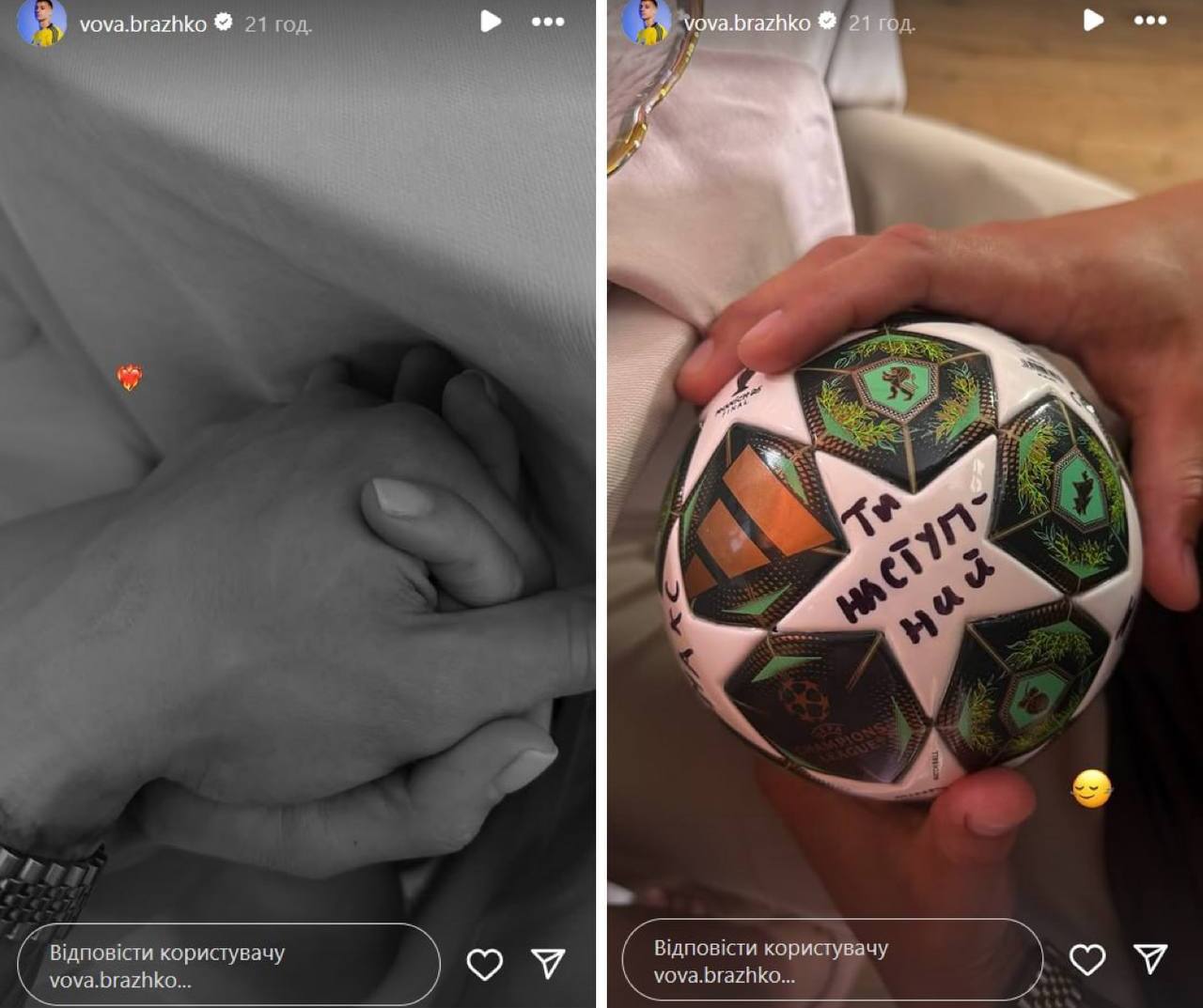 В этот же день Бражко опубликовал у себя в "сториз" загадочный кадр, на котором держит девушку за руку. На фоне - скатерть с праздничного стола. Далее Владимир показал фото маленького футбольного мяча с подписью: "Ты следующий". Похоже, что на свадьбе игрока "Динамо" вместо подвязки невесты (свадебная традиция для холостых мужчин) бросали футбольный мяч.