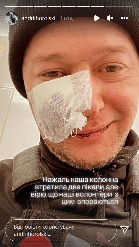 "К сожалению, наша колонна потеряла два пикапа, но верю, что наши волонтеры с этим справятся", - написал музыкант в своем блоге в Instagram. Певец также опубликовал несколько кадров, на которых показал, как ему оказывали медицинскую помощь. Видно, что он получил ранение в лицо.