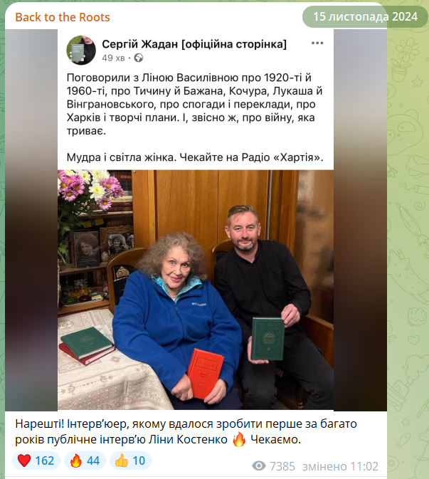 Стоит отметить, что само видео с Линой Костенко было записано в ноябре 2024 года. О соответствующем посте Жадана напомнила автор проекта об известных украинцах "Back to the Roots" Анна Лодыгина.