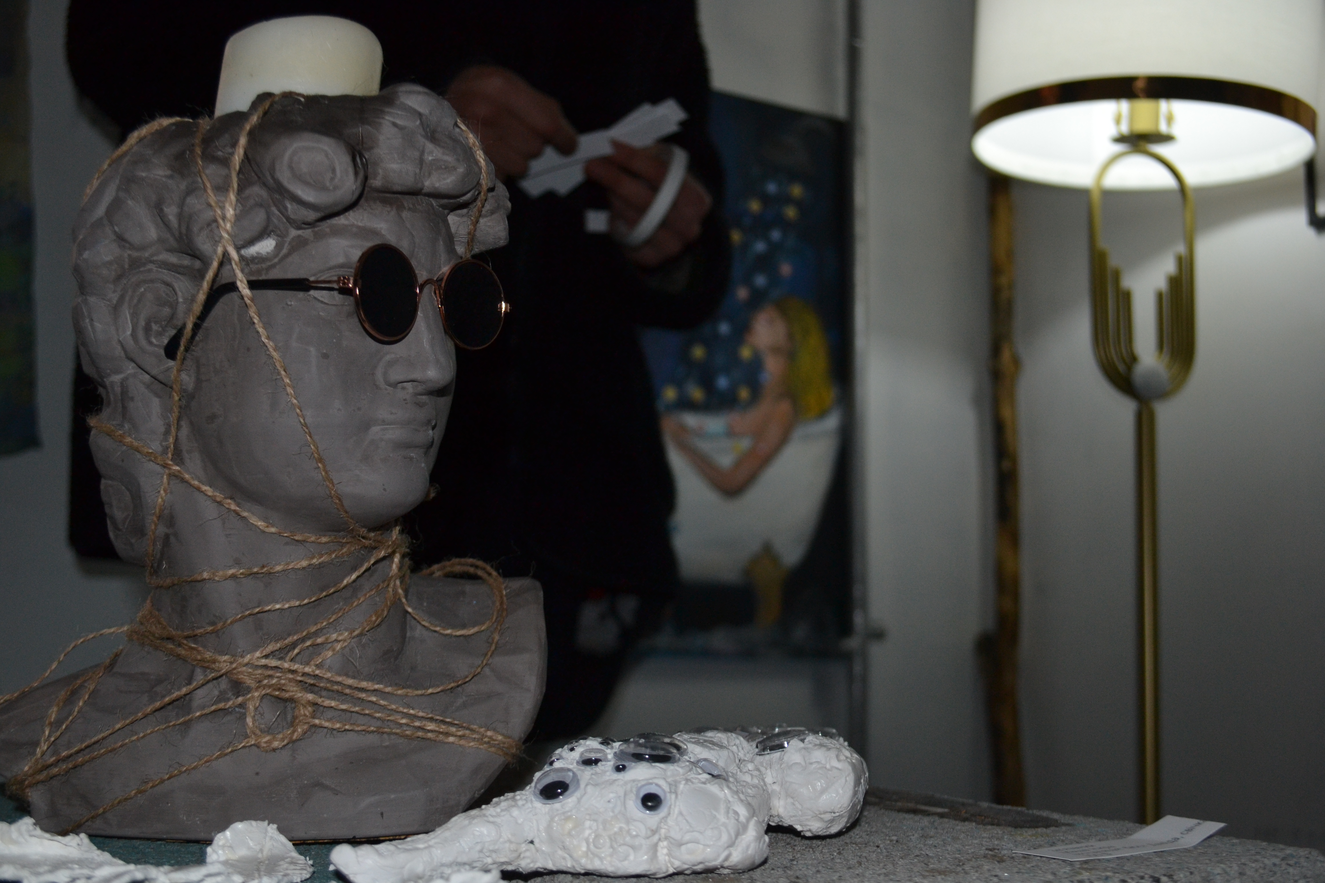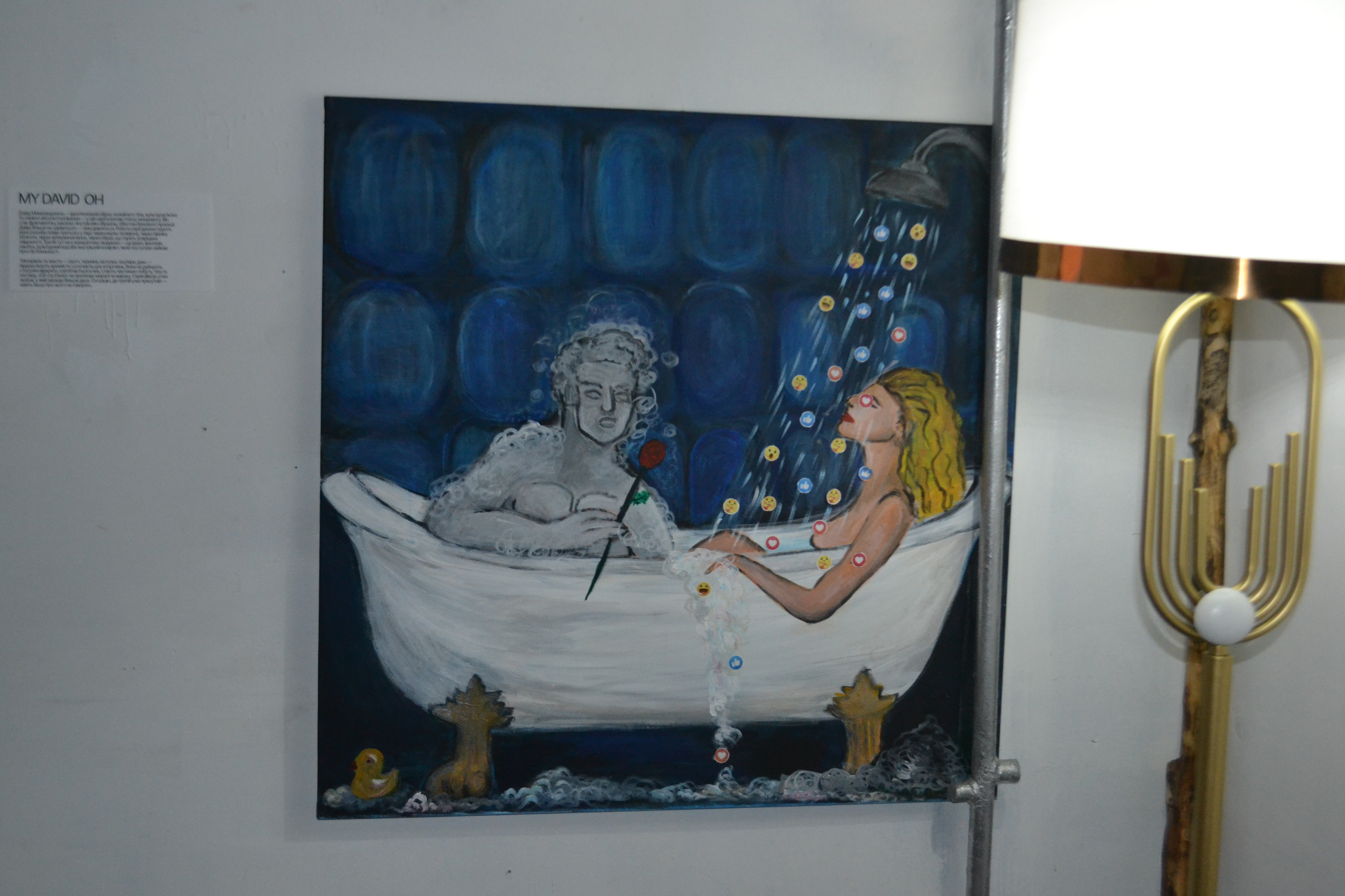 Маша Искра рассказывает о четвертой работе своей серии, которую разместили в углу под потолком: она долго колебалась, стоит ли ее выставлять, но, увидев в интернете, многие туристы приезжают во Флоренцию именно для фотографирования полового органа статуи Давида, решила добавить ее.