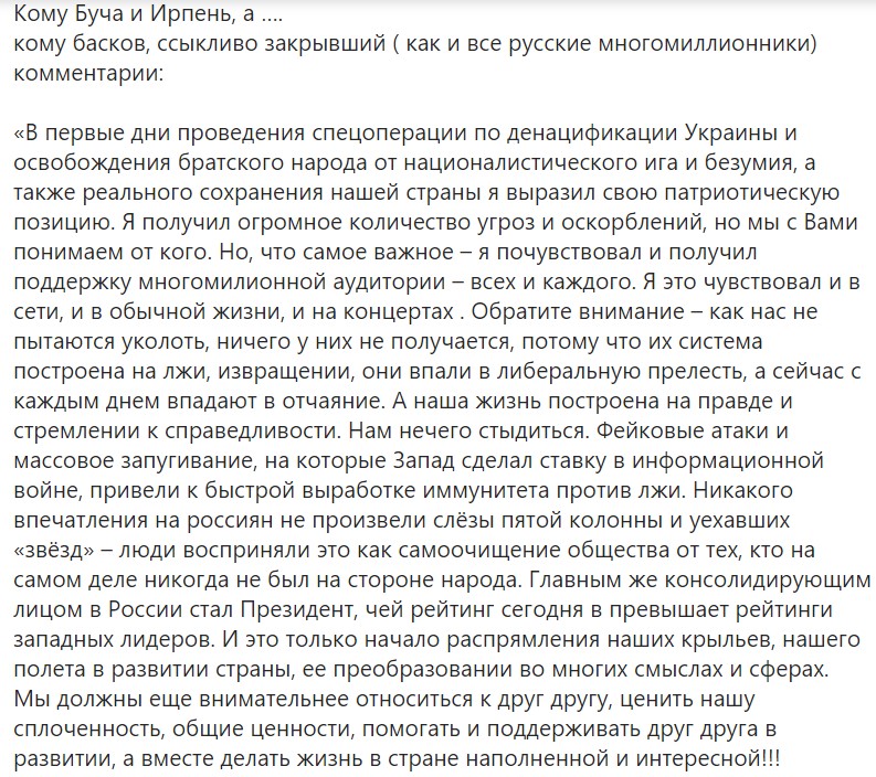 "В первые дни проведения спецоперации по денацификации Украины и освобождения братского народа от националистического ига и безумия, а также реального сохранения нашей страны я выразил свою патриотическую позицию. Я получил огромное количество угроз и оскорблений, но мы с вами понимаем от кого. Но, что самое важное – я почувствовал и получил поддержку многомилионной аудитории – всех и каждого. Я это чувствовал и в сети, и в обычной жизни, и на концертах. Обратите внимание – как нас не пытаются уколоть, ничего у них не получается, потому что их система построена на лжи, извращении, они впали в либеральную прелесть, а сейчас с каждым днем впадают в отчаяние. А наша жизнь построена на правде и стремлении к справедливости. Нам нечего стыдиться. Фейковые атаки и массовое запугивание, на которые Запад сделал ставку в информационной войне, привели к быстрой выработке иммунитета против лжи. Никакого впечатления на россиян не произвели слезы пятой колонны и уехавших "звезд" – люди восприняли это как самоочищение общества от тех, кто на самом деле никогда не был на стороне народа. Главным же консолидирующим лицом в России стал президент, чей рейтинг сегодня в превышает рейтинги западных лидеров. И это только начало распрямления наших крыльев, нашего полета в развитии страны, ее преобразовании во многих смыслах и сферах. Мы должны еще внимательнее относиться к друг другу, ценить нашу сплоченность, общие ценности, помогать и поддерживать друг друга в развитии, а вместе делать жизнь в стране наполненной и интересной! Благодарю всех за поддержку и за сплоченность", - написал путинский прихвостень Басков.