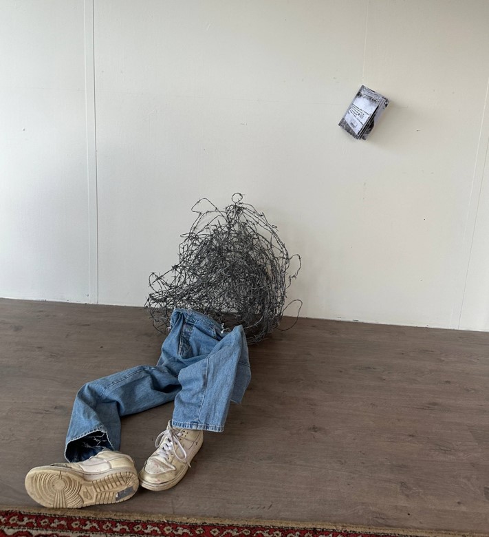 Скульптура изображает фигуру человека, который словно не смог устоять под тяжестью собственных мыслей. Вместо туловища – кучка проволоки, похожая на колючий клубок тревог, стыда и самоотрицания. Нижняя часть – в джинсах и грязных кроссовках, что придает работе тревожной человечности.