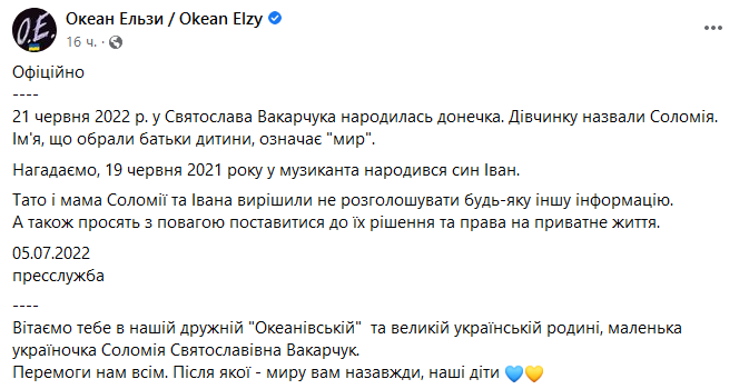 Радостную новость сообщили на странице коллектива в Facebook. "Официально. 21 июня 2022 г. у Святослава Вакарчука родилась дочь. Девочку назвали Соломией. Имя, которое выбрали родители ребенка, означает "мир", - сказано в посте.