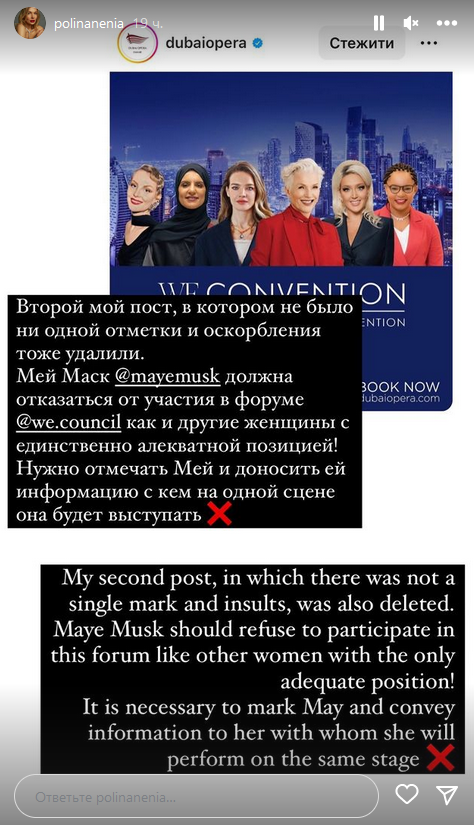 "Мэй Маск должна отказаться от участия в форуме как и другие женщины с единственно адекватной позицией! Нужно отмечать Мэй и доносить ей информацию, с кем на одной сцене она будет выступать", - призывает Полина Нэня.